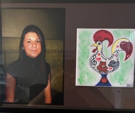 The rooster on our tile represents our heritage, our Portuguese roots and Portugal Azores where her mother and father were born. Within that body there are four symbols, which represent our family. They are as follows:
