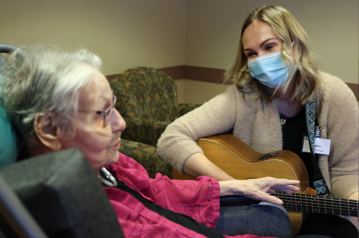 Thanks to support from Covenant Foundation, music therapy is offered weekly at Youville Home. Certified music therapist Nadine Verboa leads the sessions, which can include singing, playing an instrument, discussing music and memories, songwriting or listening to music for relaxation. She develops a therapeutic relationship with each resident, learning and connecting through music to tailor sessions to the individual.