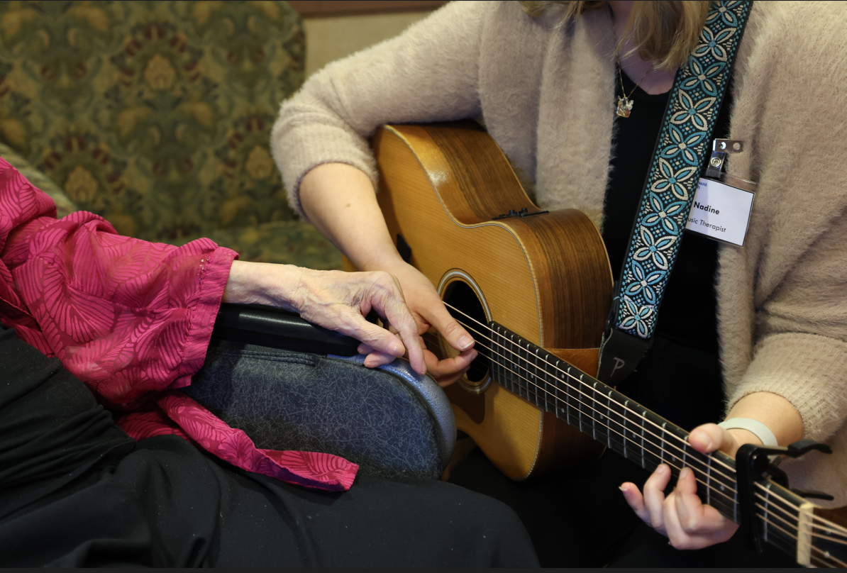 “Using a holistic and compassionate approach allows me to hold space for whatever the person needs from the music that day,” says Nadine. “For example, I might be slowing down the music and lowering the key to make it more accessible to sing, offering a small handheld instrument to engage in a joint music-making experience, matching the tempo of a song to the person’s breath to promote relaxation or using it in a way that encourages reminiscing.”