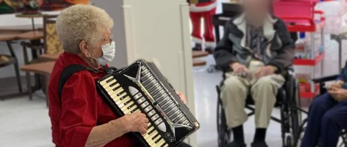Leona, 85, is a music volunteer who has been playing accordion, piano and organ at St. Mary’s, which provides long-term care and independent living, for over 20 years. She is one of many volunteer musicians who has returned to performing indoors at Covenant sites across the province after being away or performing outdoors due to pandemic restrictions.