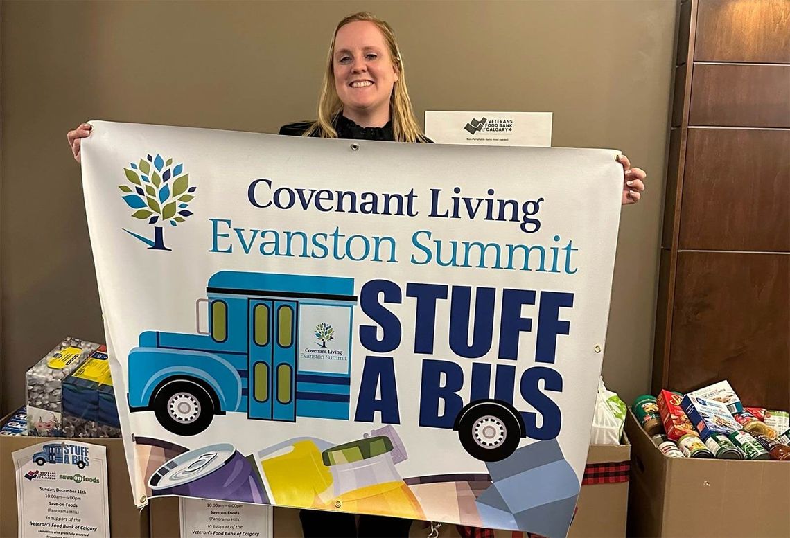 Staff and residents at Evanston Summit, our Covenant Living centre in Calgary, recently took part in a Stuff a Bus food drive, with proceeds going to the Veterans Food Bank of Calgary. Spearheaded by Victoria Slany, activities coordinator, and Mikee Ames, marketing coordinator, the multiweek-long campaign included local businesses throughout the Evanston community and ended in a large Stuff a Bus event on December 11. In total, the campaign collected 1,055 pounds of food and an additional $540 in gift cards for the city’s veterans.