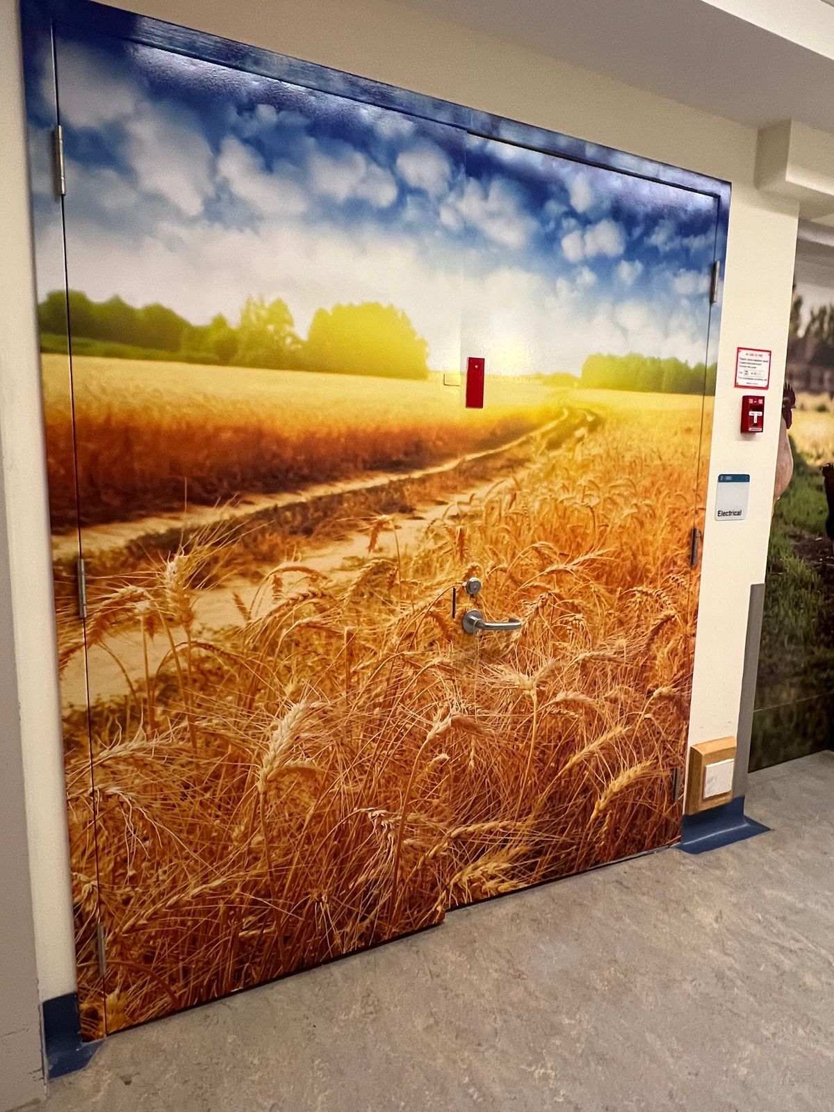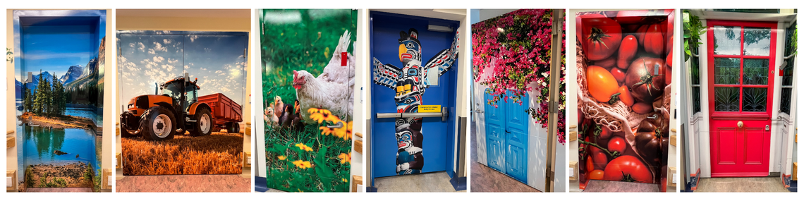 But these door wraps go far beyond aesthetics. Bold, high-contrast colours offer real benefits to aging eyes -- improving visibility, reducing confusion, and helping residents better distinguish their rooms. Bright, saturated colours can also stimulate cognitive activity and evoke emotional responses, which is especially valuable in care settings like dementia units. The nature-inspired designs also provide a sense of being outdoors, which is a great comfort during Alberta’s long, cold months when stepping outside is not always possible.